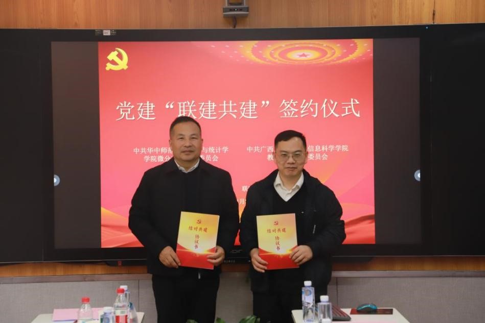 上午,我院教工第二党支部与华中师范大学数学与统计学学院微分方程党支部举行了党建联建签约仪式,郭真华与华师数统学院院长、微分方程党支部书记郭玉劲签署了《党建联建合作协议》,明确双方通过党建经验交流、党建资源共享、教育教学研讨、课程建设交流、联合开展社会实践和调查研究等方式,提升教育服务和赋能科技水平,深化实践育人成效,合力打造党建工作和教育服务品牌。