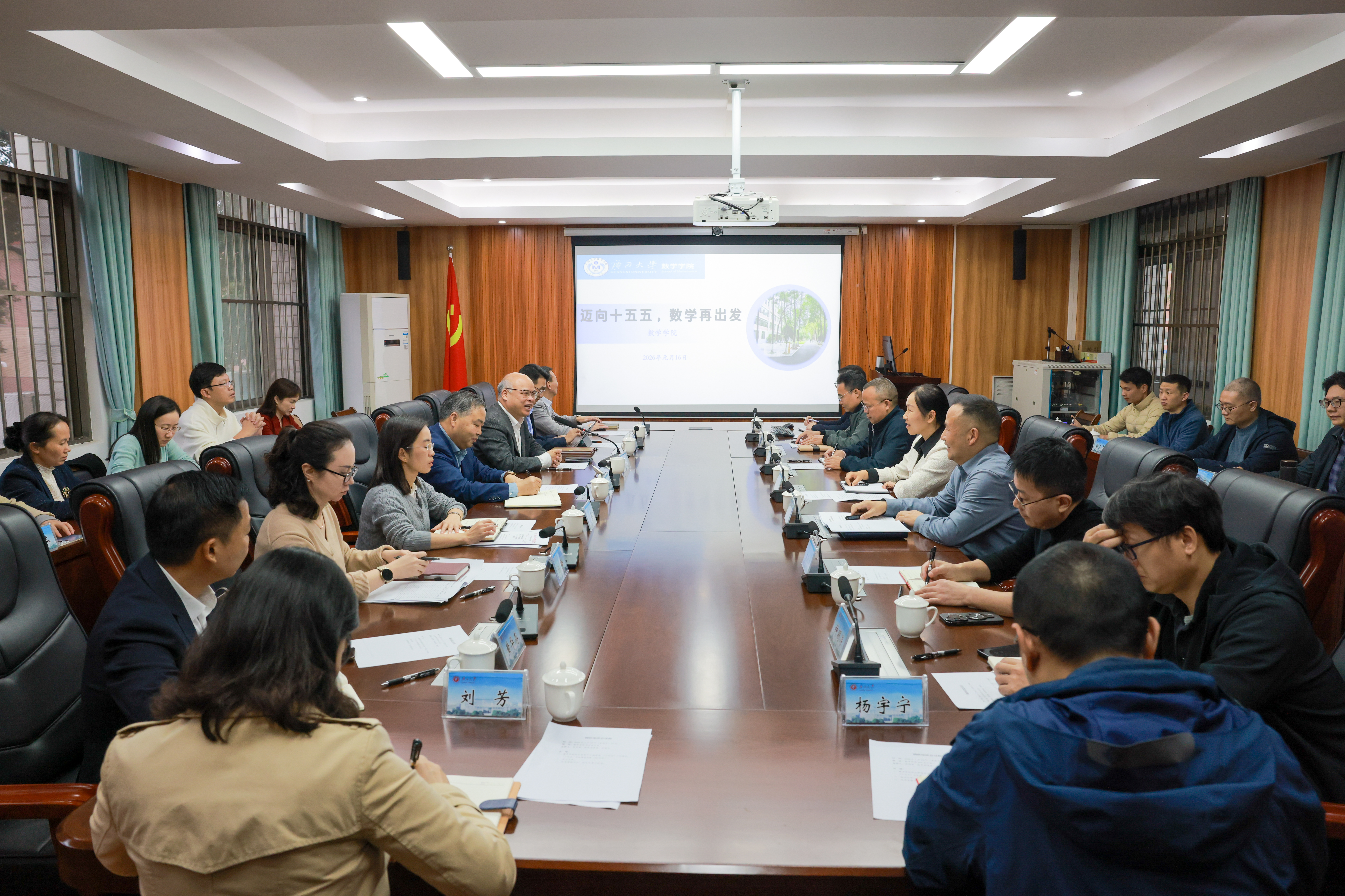 肖建庄对我院“十四五”期间取得的工作成效和对公共数学教学改革、数据科学课程改革所作的思考给予充分肯定。他指出,数学学科作为基础学科,在学校双一流建设中具有重要的战略地位,数学学院是学校学科建设及AI时代人才培养的主力军,对多个学科的高质量发展起到关键性支撑作用。他强调,面向“十五五”,数学学院要锚定“从量变到质变”的关键阶段,强化人才引育、教学创新、科研攻坚,深化人工智能赋能与产学研融合,完善制度保障与治理效能,全力打造面向东盟的数学研究与交流枢纽、区域高水平数学人才培养基地,为学校高质量发展注入更强数理动能。