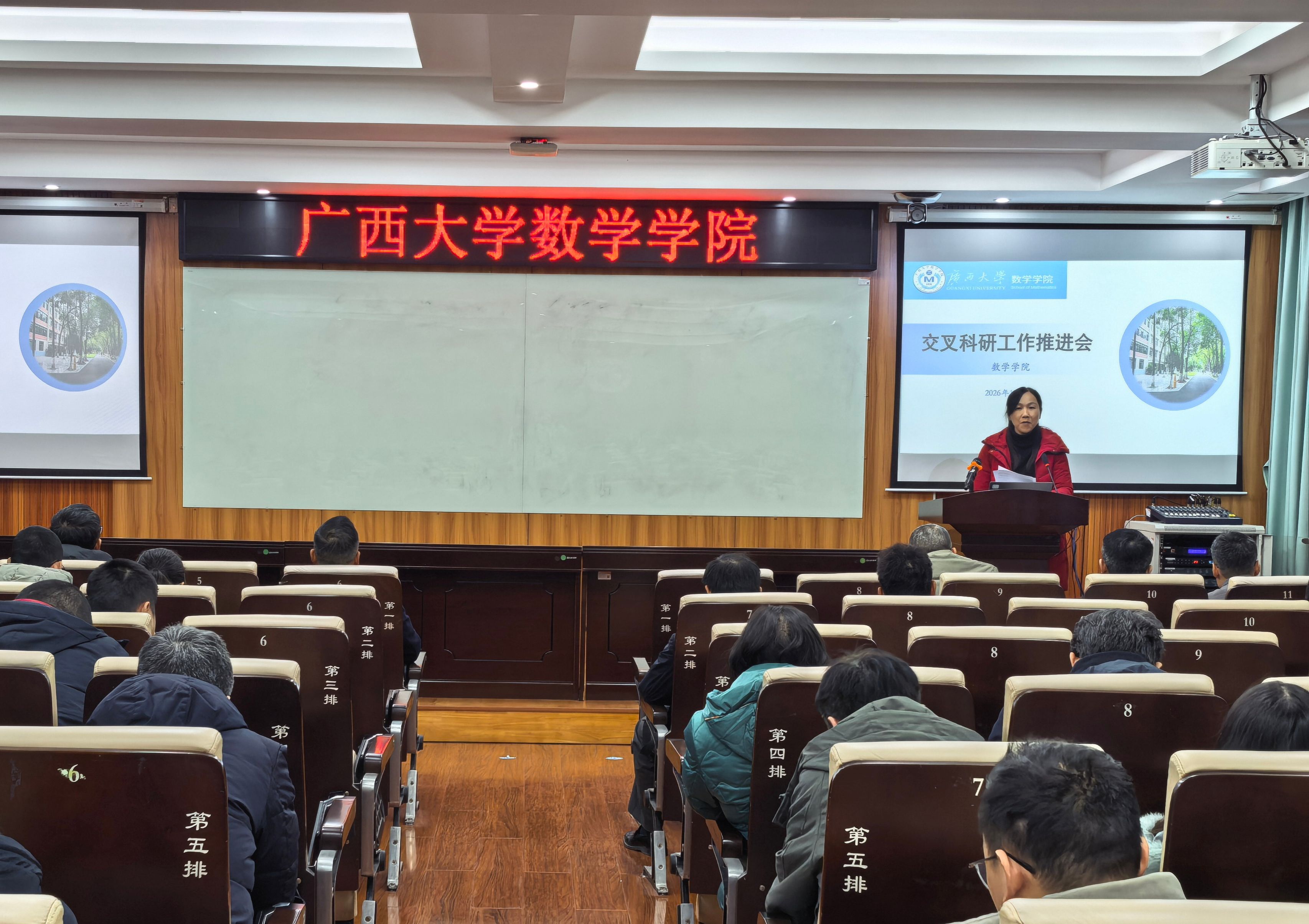 首先,院长郭真华传达了广西大学关于支撑广西十大现代化支柱产业专项工作的会议精神,对学院新的一年科研工作做了动员和部署。随后,他以《从流体力学建模看数学交叉研究》为题作了专题报告。报告围绕流体力学方程与数学建模、学科交叉背景下的应用数学研究方向展开深入论述,结合自身科研经历,分享了国家自然科学基金申报、交叉学科选题的实践经验。他强调,学院教师要主动打破学科壁垒,加强与其他学科的合作交流,在数学基础研究领域深耕细作、厚积薄发,勇于走出研究“舒适区”,积极应对学科交叉研究中的各类挑战,以双向融合、协同共进实现交叉研究的高质量发展。