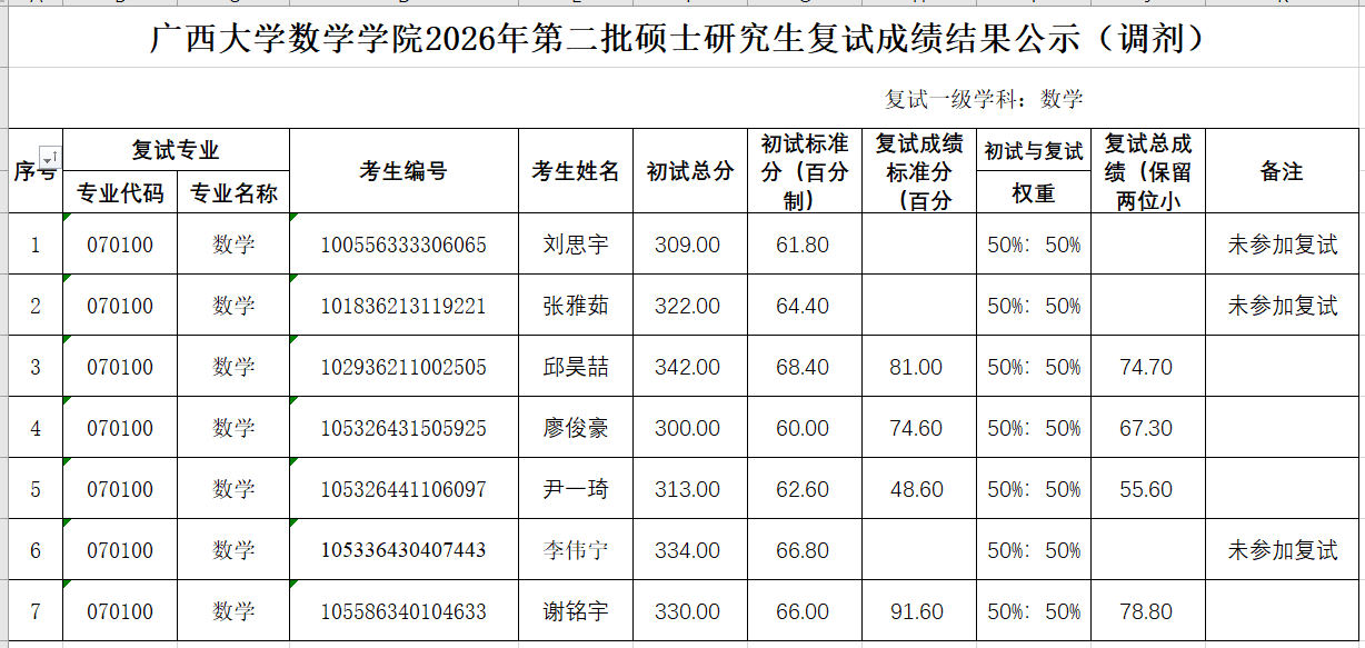 广西大学数学学院2026年第二批硕士研究生复试成绩结果公示(调剂)